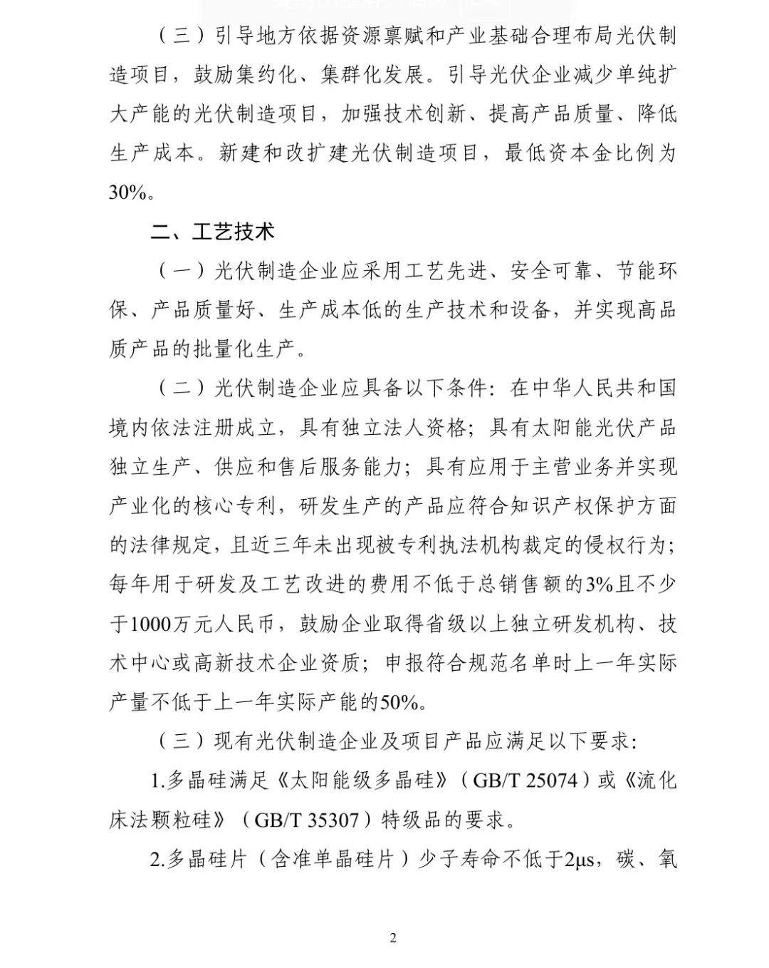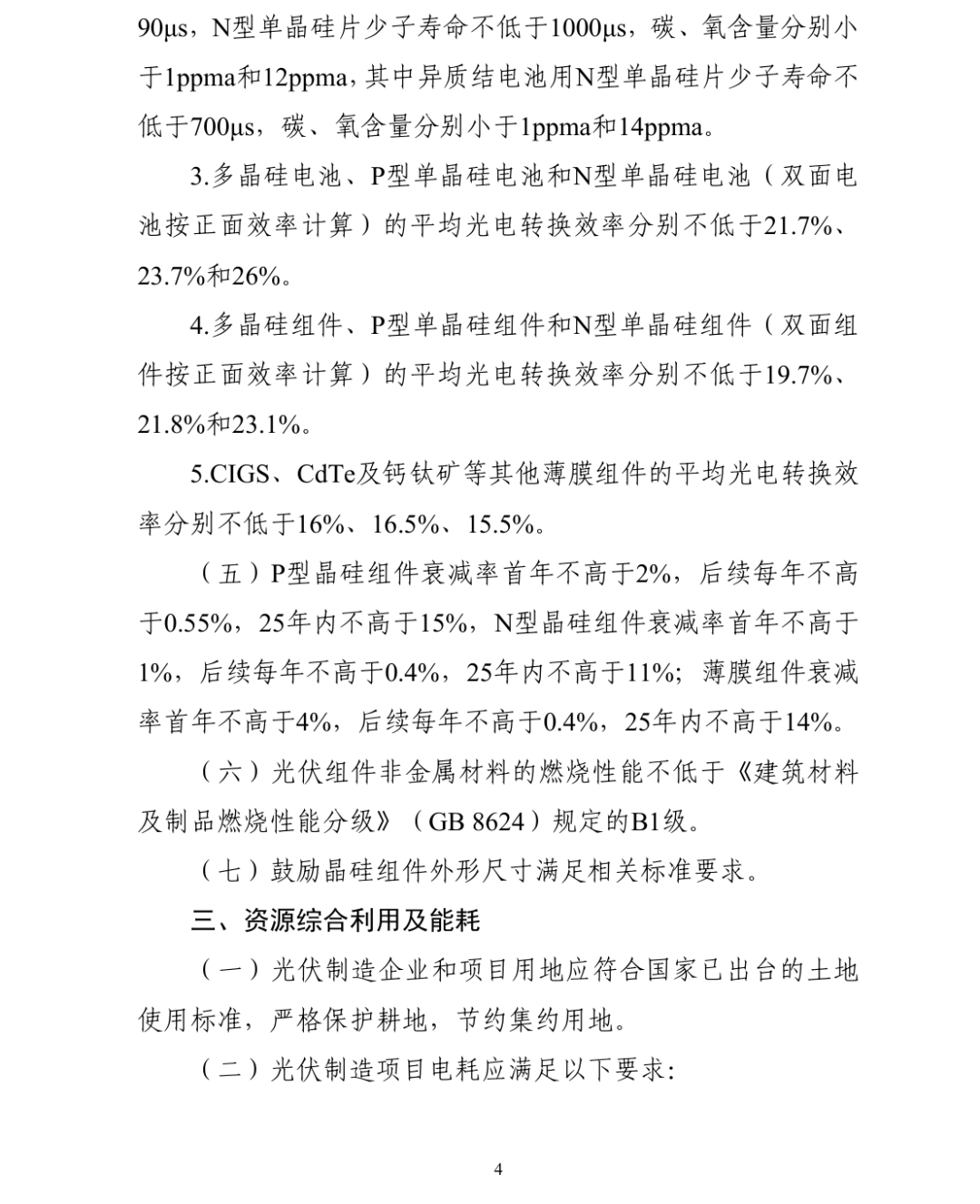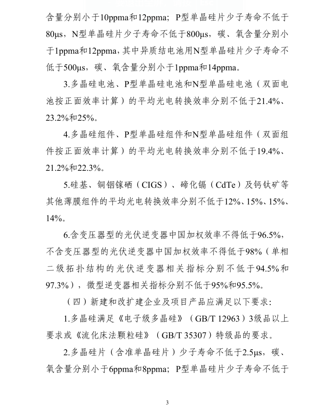 工信部:新建和改扩建光伏制造项目,最低资本金比例为30%!来源:工信部 11月20日,工信部对《光伏制造行业规范条件》和《光伏制造行业规范公告管理暂行办法》进行了修订,其中提到: 引导地方依据资源禀赋和产业基础合理布局光伏制造项目,鼓励集约化、集群化发展。引导光伏企业减少单纯扩大产能的光伏制造项目,加强技术创新、提高产品质量、降低生产成本。新建和改扩建光伏制造项目,最低资本金比例为30%。 现有光伏制造企业及项目产品应满足以下要求: 1.多晶硅满足《太阳能级多晶硅》(GB/T 25074)或《流化床法颗粒硅》(GB/T 35307)特级品的要求。 2.多晶硅片(含准单晶硅片)少子寿命不低于2μs,碳、氧含量分别小于10ppma和12ppma;P型单晶硅片少子寿命不低于80μs,N型单晶硅片少子寿命不低于800μs,碳、氧含量分别小于1ppma和12ppma,其中异质结电池用N型单晶硅片少子寿命不低于500μs,碳、氧含量分别小于1ppma和14ppma。 3.多晶硅电池、P型单晶硅电池和N型单晶硅电池(双面电池按正面效率计算)的平均光电转换效率分别不低于21.4%、23.2%和25%。 4.多晶硅组件、P型单晶硅组件和N型单晶硅组件(双面组件按正面效率计算)的平均光电转换效率分别不低于19.4%、21.2%和22.3%。 5.硅基、铜铟镓硒(CIGS)、碲化镉(CdTe)及钙钛矿等其他薄膜组件的平均光电转换效率分别不低于12%、15%、15%、14%。 6.含变压器型的光伏逆变器中国加权效率不得低于96.5%,不含变压器型的光伏逆变器中国加权效率不得低于98%(单相二级拓扑结构的光伏逆变器相关指标分别不低于94.5%和97.3%),微型逆变器相关指标分别不低于95%和95.5%。 文件原文如下: