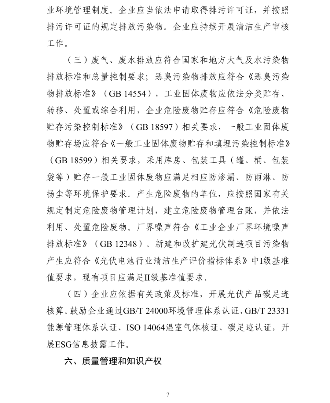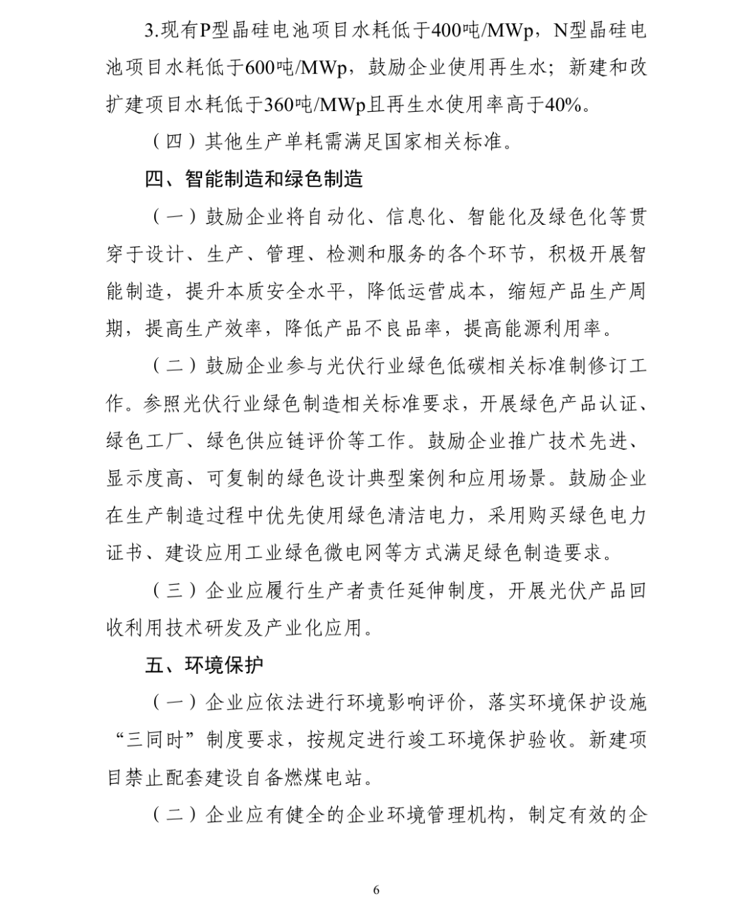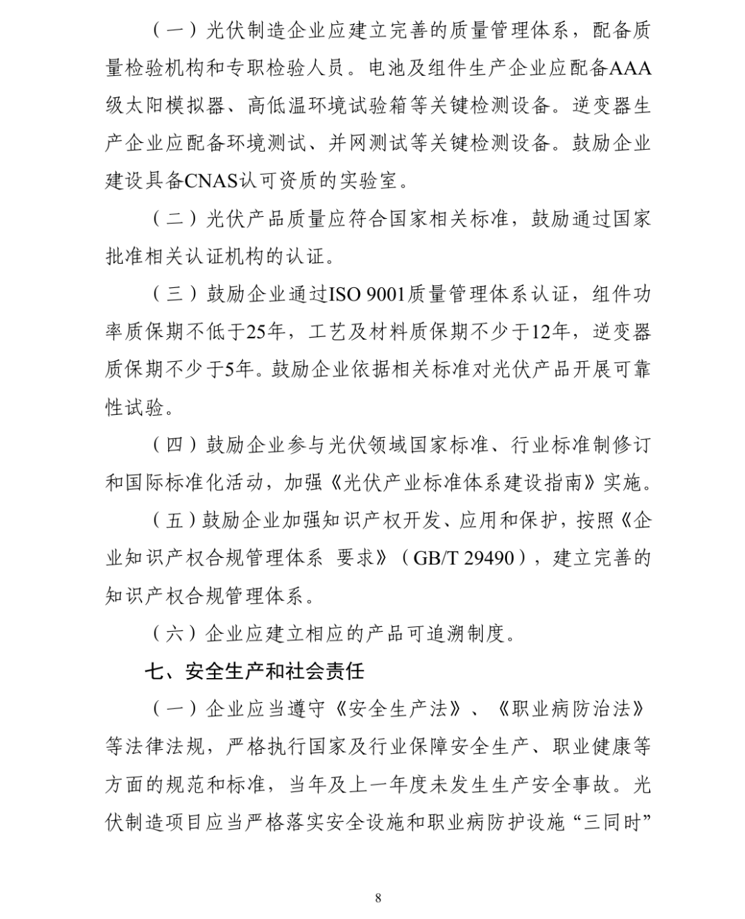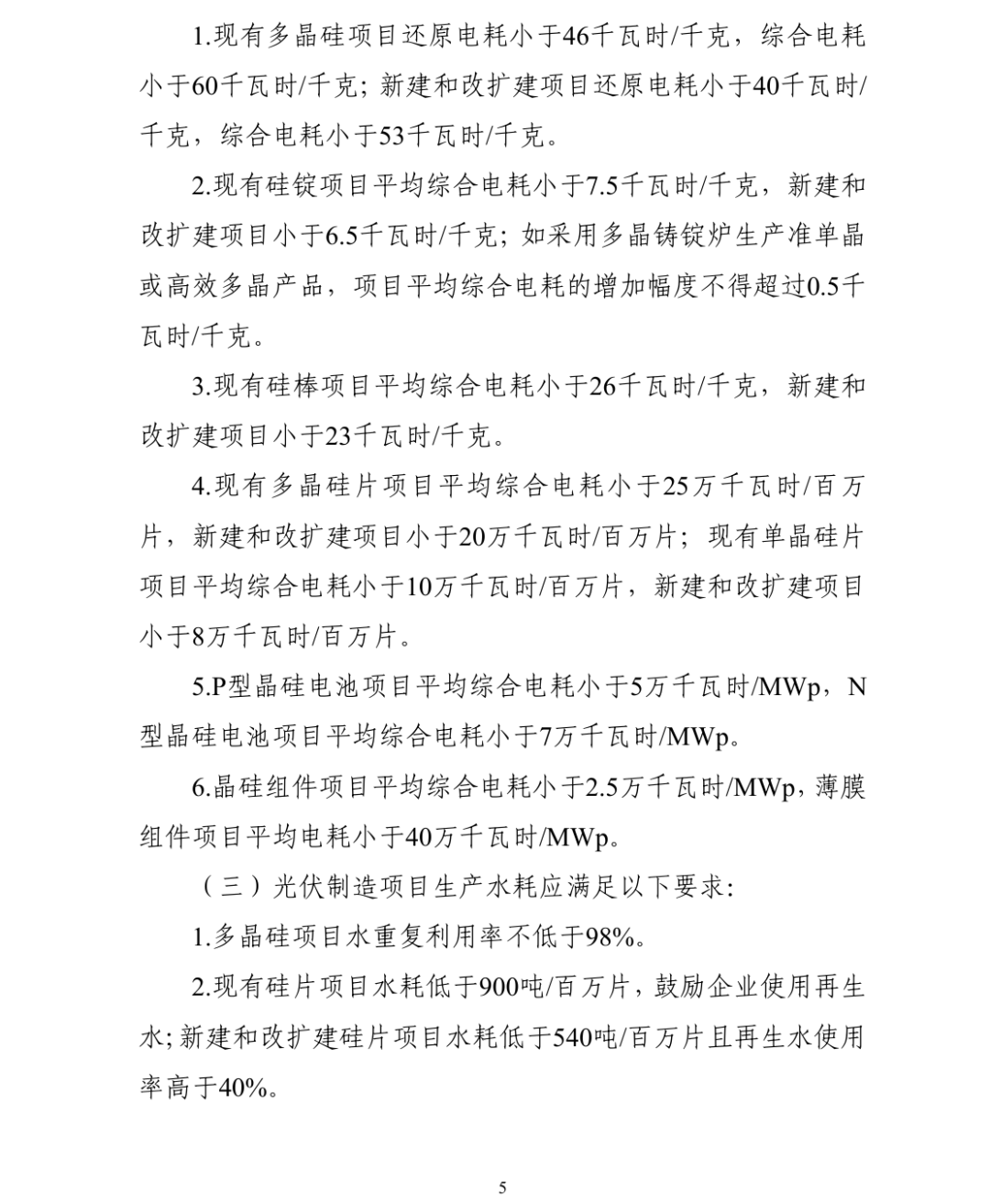 工信部:新建和改扩建光伏制造项目,最低资本金比例为30%!来源:工信部 11月20日,工信部对《光伏制造行业规范条件》和《光伏制造行业规范公告管理暂行办法》进行了修订,其中提到: 引导地方依据资源禀赋和产业基础合理布局光伏制造项目,鼓励集约化、集群化发展。引导光伏企业减少单纯扩大产能的光伏制造项目,加强技术创新、提高产品质量、降低生产成本。新建和改扩建光伏制造项目,最低资本金比例为30%。 现有光伏制造企业及项目产品应满足以下要求: 1.多晶硅满足《太阳能级多晶硅》(GB/T 25074)或《流化床法颗粒硅》(GB/T 35307)特级品的要求。 2.多晶硅片(含准单晶硅片)少子寿命不低于2μs,碳、氧含量分别小于10ppma和12ppma;P型单晶硅片少子寿命不低于80μs,N型单晶硅片少子寿命不低于800μs,碳、氧含量分别小于1ppma和12ppma,其中异质结电池用N型单晶硅片少子寿命不低于500μs,碳、氧含量分别小于1ppma和14ppma。 3.多晶硅电池、P型单晶硅电池和N型单晶硅电池(双面电池按正面效率计算)的平均光电转换效率分别不低于21.4%、23.2%和25%。 4.多晶硅组件、P型单晶硅组件和N型单晶硅组件(双面组件按正面效率计算)的平均光电转换效率分别不低于19.4%、21.2%和22.3%。 5.硅基、铜铟镓硒(CIGS)、碲化镉(CdTe)及钙钛矿等其他薄膜组件的平均光电转换效率分别不低于12%、15%、15%、14%。 6.含变压器型的光伏逆变器中国加权效率不得低于96.5%,不含变压器型的光伏逆变器中国加权效率不得低于98%(单相二级拓扑结构的光伏逆变器相关指标分别不低于94.5%和97.3%),微型逆变器相关指标分别不低于95%和95.5%。 文件原文如下: