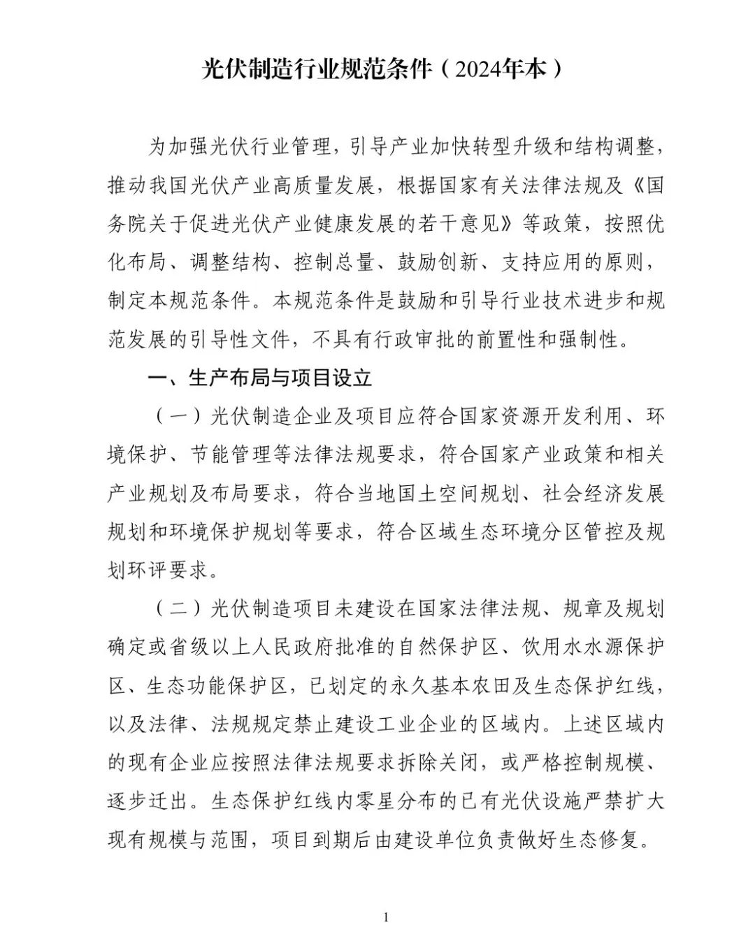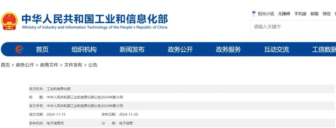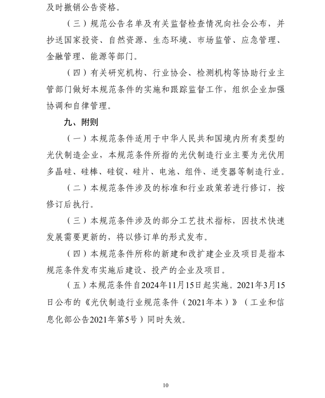 中华人民共和国工业和信息化部公告2024年第33号 为贯彻落实党中央、国务院决策部署,进一步加强光伏行业规范管理,推动产业加快转型升级和结构调整,推动我国光伏产业高质量发展,工业和信息化部对《光伏制造行业规范条件》和《光伏制造行业规范公告管理暂行办法》进行了修订,现予以公告。《光伏制造行业规范条件(2021年本)》和《光伏制造行业规范公告管理暂行办法(2021年本)》(工业和信息化部公告2021年第5号)同时失效。 工业和信息化部 2024年11月15日
