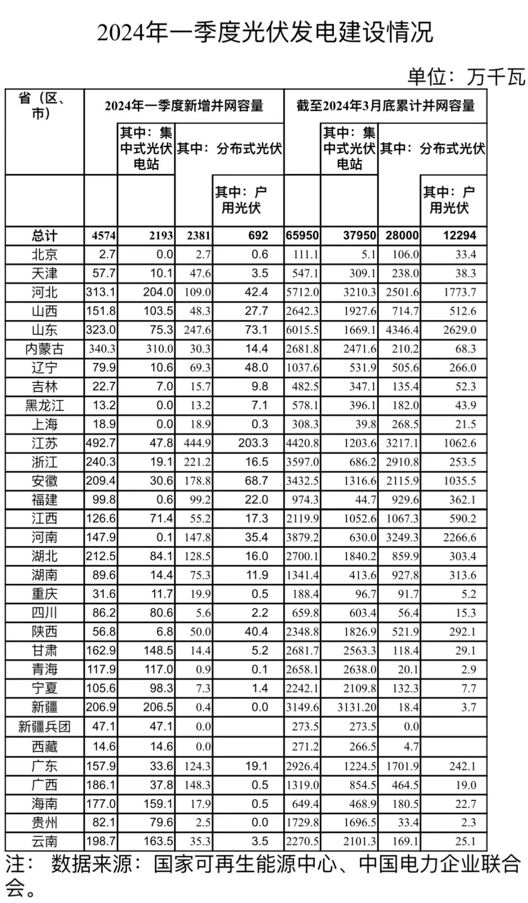 陕西一季度光伏新增装机容量56.8万千瓦!来源:国家能源局 2024年5月6日,国家能源局公示了2024年一季度的光伏新增装机情况。 一、光伏整体装机情况 一季度,光伏新增装机4574万千瓦,累计装机65950万千瓦。 新增装机中, 户用光伏:新增692万千瓦; 工商业分布式:新增1689 万千瓦; 地面电站:新增2193 万千瓦。 二、陕西省光伏整体装机情况 一季度,光伏新增装机56.8万千瓦,累计装机2348.8 万千瓦。 新增装机中, 户用光伏:新增40.4万千瓦; 工商业分布式:新增9.6万千瓦; 地面电站:新增6.8万千瓦。