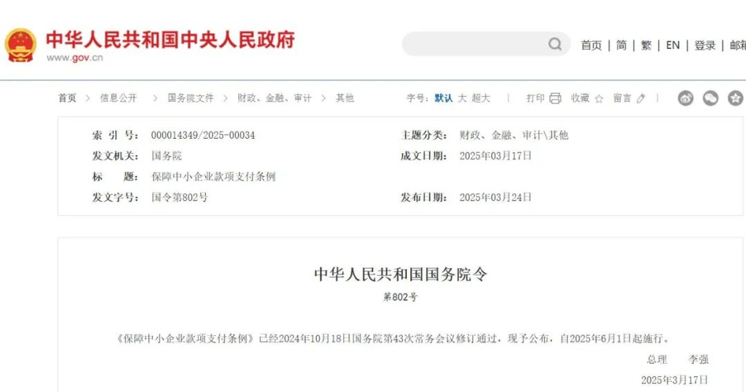 国务院令!保障中小企业款项支付来源:国务院 李强签署国务院令公布修订后的《保障中小企业款项支付条例》 新华社北京3月24日电 国务院总理李强日前签署国务院令,公布修订后的《保障中小企业款项支付条例》(以下简称《条例》),自2025年6月1日起施行。《条例》共5章37条,修订的主要内容如下。 一是明确工作职责。细化规定国家和地方层面负责中小企业促进工作综合管理的部门,以及发展改革、财政、住房城乡建设、交通运输、水利、金融管理、国有资产监管、市场监督管理等有关部门,在保障中小企业款项支付工作中的职责。强调省、自治区、直辖市人民政府对本行政区域内保障中小企业款项支付工作负总责。 二是强化款项支付责任。明确机关、事业单位和大型企业支付中小企业款项的期限要求,增加规定大型企业应当自货物、工程、服务交付之日起60日内支付款项;按照行业规范、交易习惯合理约定付款期限的,不得约定以收到第三方付款作为向中小企业支付款项的条件或者按照第三方付款进度比例支付中小企业款项。增加规定机关、事业单位和大型企业与中小企业的交易,部分存在争议但不影响其他部分履行的,对于无争议部分应当履行及时付款义务。 三是完善监督管理和投诉处理措施。增加规定县级以上人民政府及其有关部门通过监督检查、函询约谈、督办通报、投诉处理等措施,加大清理拖欠力度。明确受理投诉部门、处理投诉部门、投诉人、被投诉人等各主体的权利义务及投诉处理时限。规定拖欠中小企业款项情节严重或者造成严重不良社会影响的,对大型企业在财政资金支持、投资项目审批等方面依法依规予以限制。 四是加大违法处罚力度。对国有大型企业拖欠中小企业款项造成不良后果或者影响的,以及机关、事业单位和大型企业及其工作人员的打击报复、滥用职权、玩忽职守等违法行为,补充完善了相关法律责任。 ![]() 保障中小企业款项支付条例 (2020年7月5日中华人民共和国国务院令第728号公布 2025年3月17日中华人民共和国国务院令第802号修订) 第一章 总 则 第一条 为了促进机关、事业单位和大型企业及时支付中小企业款项,维护中小企业合法权益,优化营商环境,根据《中华人民共和国中小企业促进法》等法律,制定本条例。 第二条 机关、事业单位和大型企业采购货物、工程、服务支付中小企业款项,应当遵守本条例。 第三条 本条例所称中小企业,是指在中华人民共和国境内依法设立,依据国务院批准的中小企业划分标准确定的中型企业、小型企业和微型企业;所称大型企业,是指中小企业以外的企业。 中小企业、大型企业依合同订立时的企业规模类型确定。中小企业与机关、事业单位、大型企业订立合同时,应当主动告知其属于中小企业。 第四条 保障中小企业款项支付工作,应当贯彻落实党和国家的路线方针政策、决策部署,坚持支付主体负责、行业规范自律、政府依法监管、社会协同监督的原则,依法防范和治理拖欠中小企业款项问题。 第五条 国务院负责中小企业促进工作综合管理的部门对保障中小企业款项支付工作进行综合协调、监督检查。国务院发展改革、财政、住房城乡建设、交通运输、水利、金融管理、国有资产监管、市场监督管理等有关部门应当按照职责分工,负责保障中小企业款项支付相关工作。 省、自治区、直辖市人民政府对本行政区域内保障中小企业款项支付工作负总责,加强组织领导、统筹协调,健全制度机制。县级以上地方人民政府负责本行政区域内保障中小企业款项支付的管理工作。 县级以上地方人民政府负责中小企业促进工作综合管理的部门和发展改革、财政、住房城乡建设、交通运输、水利、金融管理、国有资产监管、市场监督管理等有关部门应当按照职责分工,负责保障中小企业款项支付相关工作。 第六条 有关行业协会商会应当按照法律法规和组织章程,加强行业自律管理,规范引导本行业大型企业履行及时支付中小企业款项义务、不得利用优势地位拖欠中小企业款项,为中小企业提供信息咨询、权益保护、纠纷处理等方面的服务,保护中小企业合法权益。 鼓励大型企业公开承诺向中小企业采购货物、工程、服务的付款期限与方式。 第七条 机关、事业单位和大型企业不得要求中小企业接受不合理的付款期限、方式、条件和违约责任等交易条件,不得拖欠中小企业的货物、工程、服务款项。 中小企业应当依法经营,诚实守信,按照合同约定提供合格的货物、工程和服务。 第二章 款项支付规定 第八条 机关、事业单位使用财政资金从中小企业采购货物、工程、服务,应当严格按照批准的预算执行,不得无预算、超预算开展采购。 政府投资项目所需资金应当按照国家有关规定确保落实到位,不得由施工单位垫资建设。 第九条 机关、事业单位从中小企业采购货物、工程、服务,应当自货物、工程、服务交付之日起30日内支付款项;合同另有约定的,从其约定,但付款期限最长不得超过60日。 大型企业从中小企业采购货物、工程、服务,应当自货物、工程、服务交付之日起60日内支付款项;合同另有约定的,从其约定,但应当按照行业规范、交易习惯合理约定付款期限并及时支付款项,不得约定以收到第三方付款作为向中小企业支付款项的条件或者按照第三