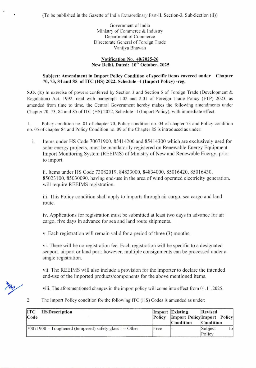 印度收紧太阳能电池等光伏产品的进口监管10月10日,印度贸易总局强制要求太阳能和风能部件进口商在可再生能源设备进口监控系统中注册部分进口产品,包括钢化安全玻璃、光伏电池、光敏半导体器件(含太阳能电池,无论是否组装成组件或面板)等太阳能产品和塔架、轴承座、齿轮和传动装置等风力涡轮机部件。 该新规将于2025年11月1日生效,且登记需在货物通过空运、海运、陆运前相应时间提交,空运货物需至少提前两天提交注册申请,海运及陆路运输则需提前五天,有效期为三个月,其中海运登记针对指定港口,陆运和空运多批货物可合并至一份登记中处理。 此前,印度商工部已对原产于或进口自中国的无论是否组装成模块或制成面板的太阳能电池作出反倾销肯定性终裁,并征收最高30%、为期三年的反倾销税。该修订清单将会进一步影响光伏产品对印度的出口,相关企业应及时开展预警并做好应对工作。 ![]() ![]() |